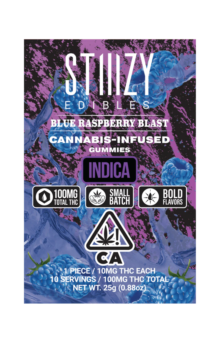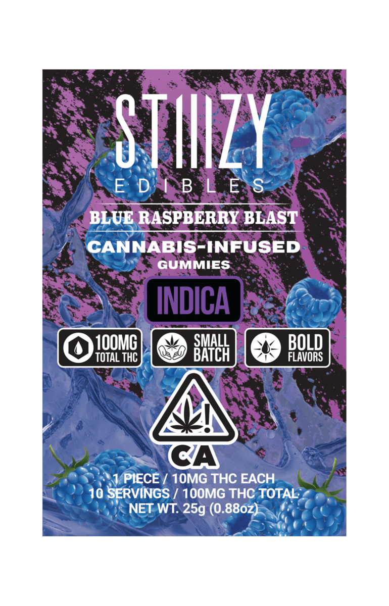 Presenting the latest innovation in STIIIZY's edibles. Cutting-edge formulas incorporate bold flavor blends, resulting in a more delectable and satisfying experience. BLUE RASPBERRY BLAST TASTE: Berry, Sweet FEELING: Relaxing, Happy, Sleep DESCRIPTION: Blue Raspberry Blast is a fruity, flavorful indica, sure to help you blast off — to sleep, that is.